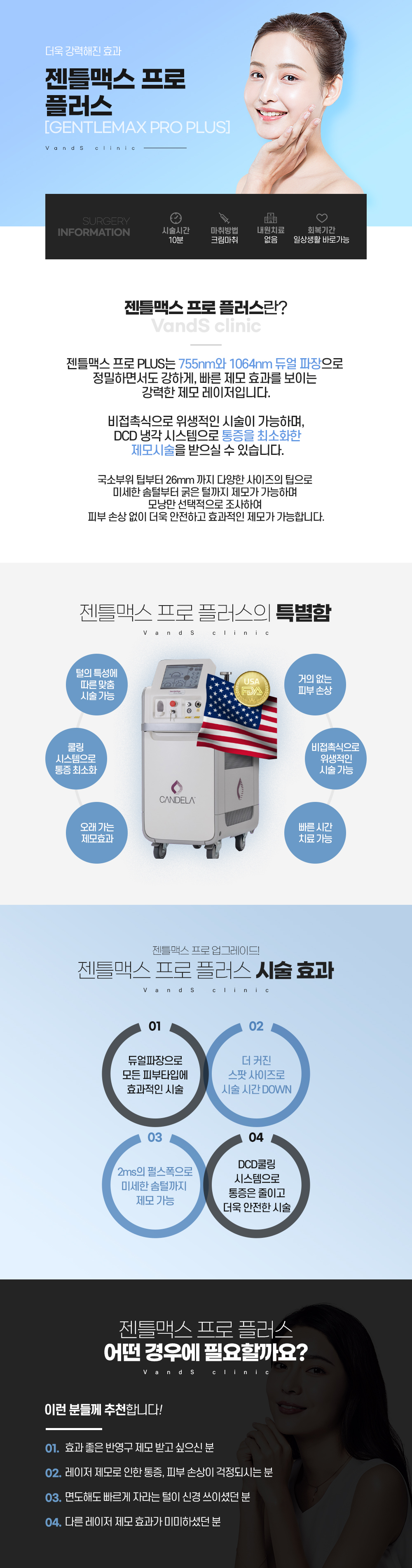 A. 반복 시술 시 반영구적으로 모발의 굵기, 올라오는 주기가 감소합니다. 시술 이후 개인에 따라 모가 다시 올라올 수 있으며, 이 때 추가적인 레이저제모 시술을 통해 제모 효과를 더 오래 누리실 수 있습니다.